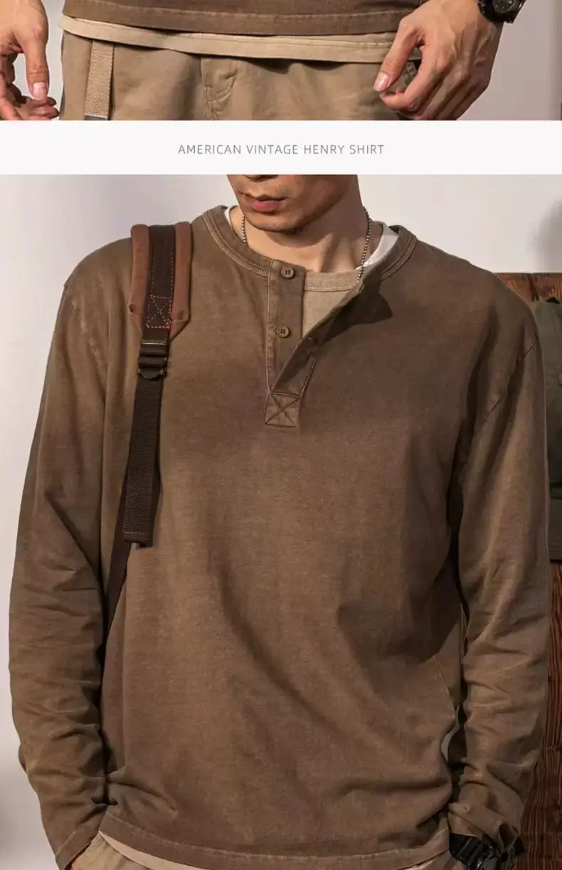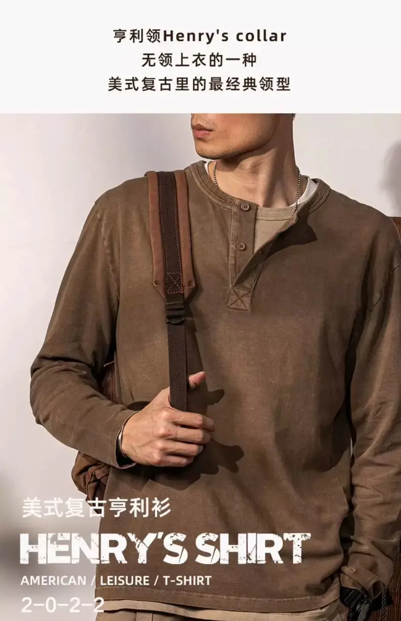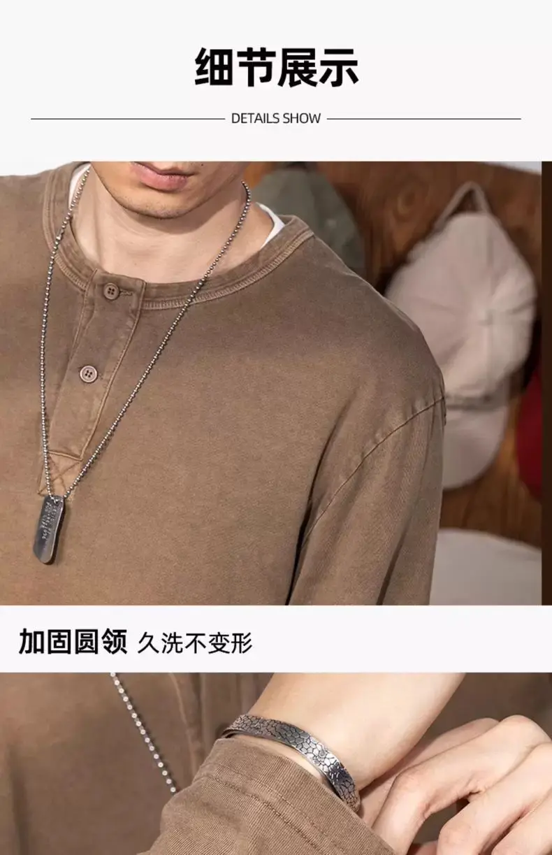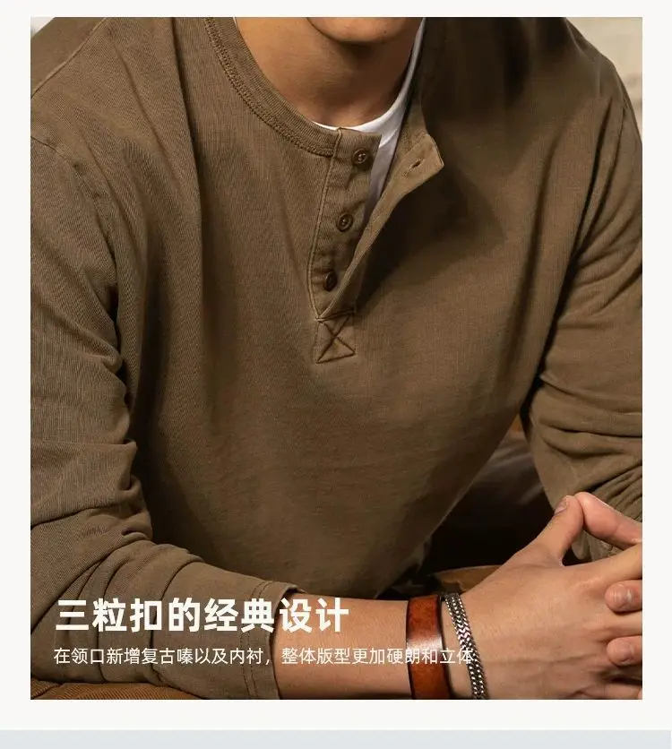 American Retro Henry Neck Long-sleeved T-shirt Spring and Autumn New Men's Solid Color Loose Base Shirt Underwear Top