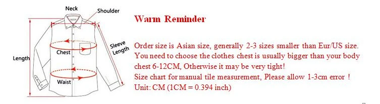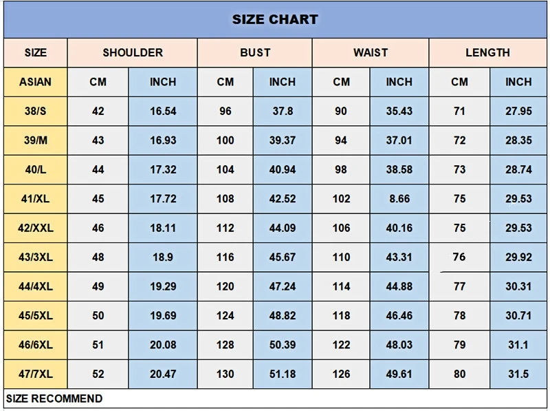 Tips:1,Our size is Asian size , all measures Exist 1-2cm error !Leave me your Shoulder,Bust ,weight in KG and height in cm,you must contact with us if you are not sure of your size . 2,Please not made dispute ,You can contact us free if it is not fit we can service you exchange .thanks .